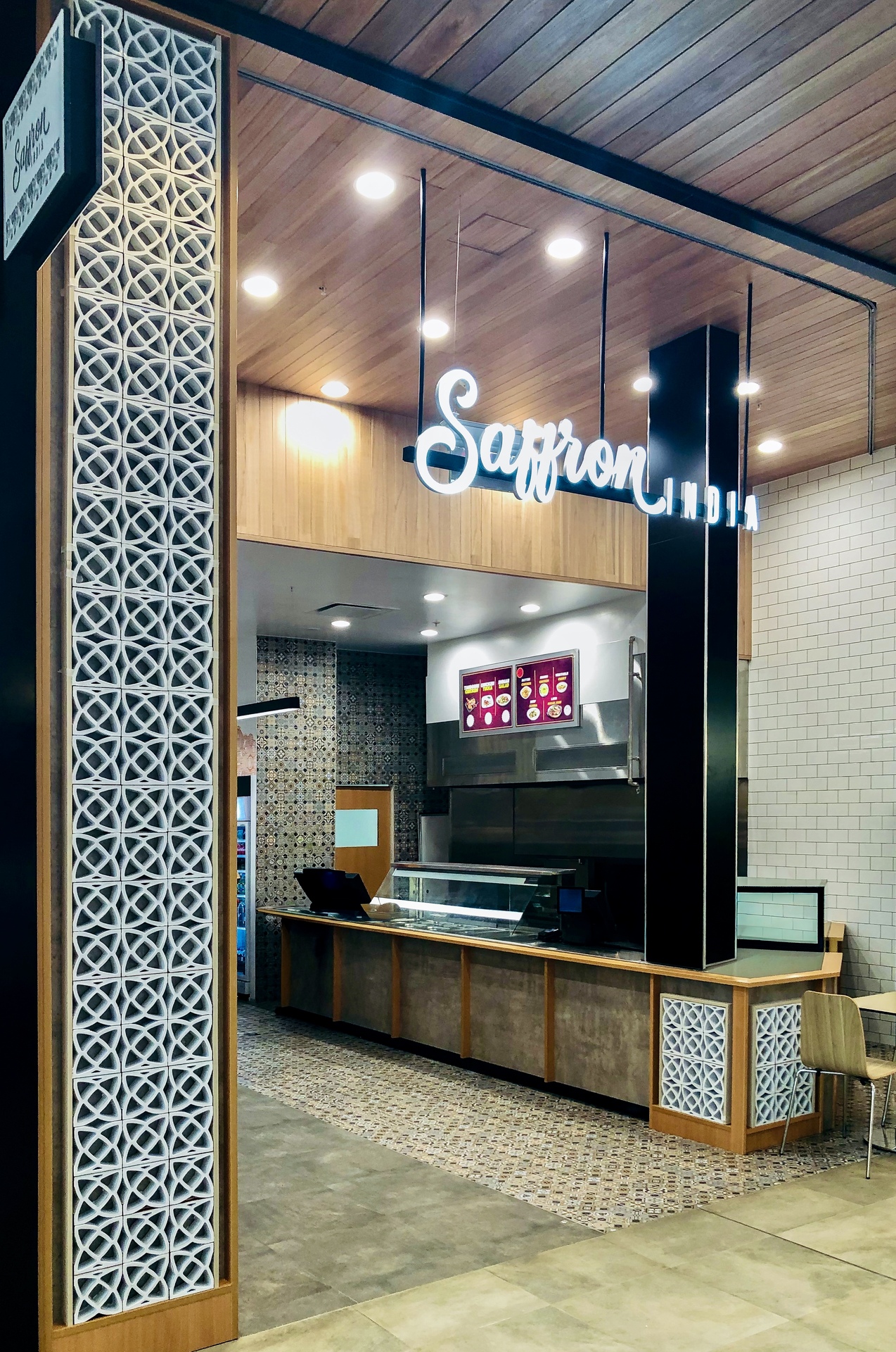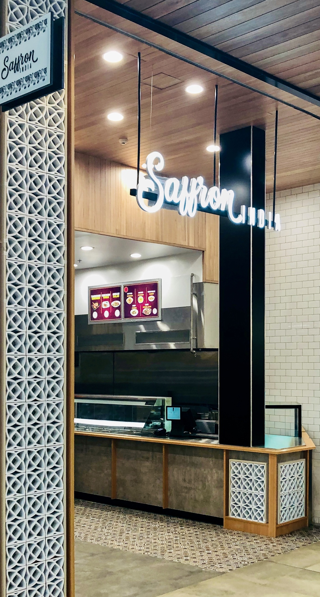 A striking food court tenancy fit-out demonstrating our ability to deliver highly complex F&B projects in tight spaces. The build features bespoke decorative screens and custom millwork counters that integrate seamlessly with heavy-duty commercial kitchen equipment and specialized ventilation systems.